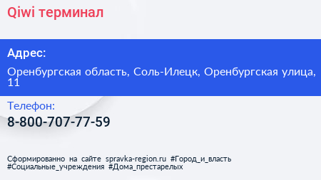 Qiwi, терминал по адресу Оренбургская область, Соль-Илецк, Оренбургская улица, 11 в дальнейшем Организация, размещена в следующих категориях: