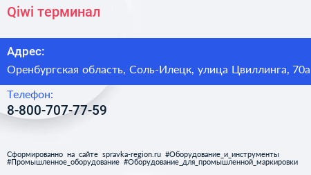 Qiwi, терминал по адресу Оренбургская область, Соль-Илецк, улица Цвиллинга, 70а в дальнейшем Организация, размещена в следующих категориях: