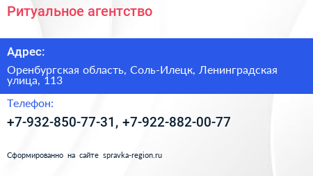 Ритуальное агентство по адресу Оренбургская область, Соль-Илецк, Ленинградская улица, 113 в дальнейшем Организация, размещена в следующих категориях: