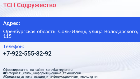 ТСН Содружество по адресу Оренбургская область, Соль-Илецк, улица Володарского, 115 в дальнейшем Организация, размещена в следующих категориях: