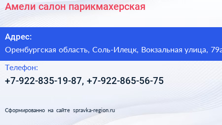 Амели, салон-парикмахерская по адресу Оренбургская область, Соль-Илецк, Вокзальная улица, 79а в дальнейшем Организация, размещена в следующих категориях: