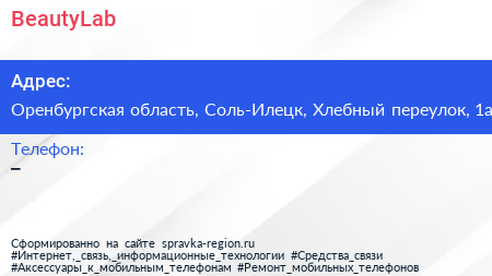 BeautyLab по адресу Оренбургская область, Соль-Илецк, Хлебный переулок, 1а в дальнейшем Организация, размещена в следующих категориях: