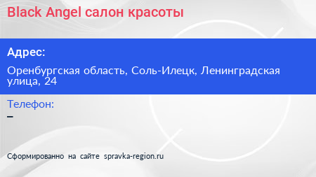 Black Angel, салон красоты по адресу Оренбургская область, Соль-Илецк, Ленинградская улица, 24 в дальнейшем Организация, размещена в следующих категориях: