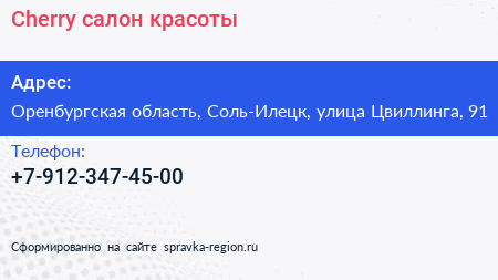 Cherry, салон красоты по адресу Оренбургская область, Соль-Илецк, улица Цвиллинга, 91 в дальнейшем Организация, размещена в следующих категориях: