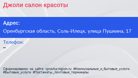 Джоли, салон красоты по адресу Оренбургская область, Соль-Илецк, улица Пушкина, 17 в дальнейшем Организация, размещена в следующих категориях:
