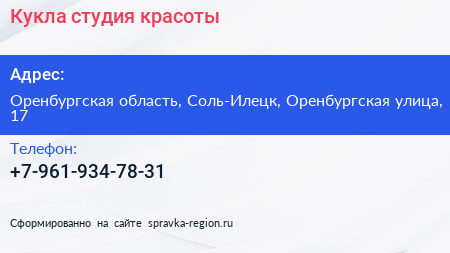 Кукла, студия красоты по адресу Оренбургская область, Соль-Илецк, Оренбургская улица, 17 в дальнейшем Организация, размещена в следующих категориях: