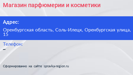 Магазин парфюмерии и косметики по адресу Оренбургская область, Соль-Илецк, Оренбургская улица, 15 в дальнейшем Организация, размещена в следующих категориях: