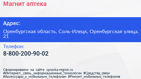 Магнит, аптека по адресу Оренбургская область, Соль-Илецк, Оренбургская улица, 21 в дальнейшем Организация, размещена в следующих категориях: