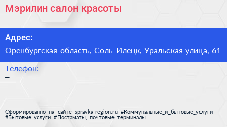 Мэрилин, салон красоты по адресу Оренбургская область, Соль-Илецк, Уральская улица, 61 в дальнейшем Организация, размещена в следующих категориях: