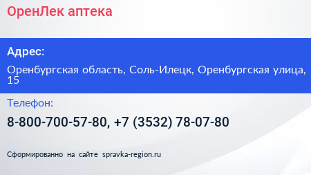 ОренЛек, аптека по адресу Оренбургская область, Соль-Илецк, Оренбургская улица, 15 в дальнейшем Организация, размещена в следующих категориях: