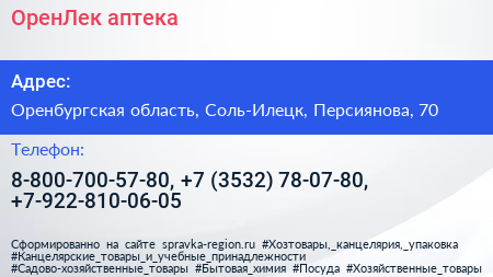 ОренЛек, аптека по адресу Оренбургская область, Соль-Илецк, Персиянова, 70 в дальнейшем Организация, размещена в следующих категориях: