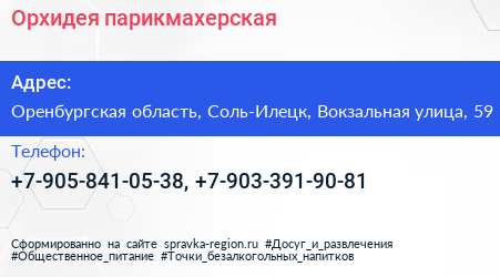 Орхидея, парикмахерская по адресу Оренбургская область, Соль-Илецк, Вокзальная улица, 59 в дальнейшем Организация, размещена в следующих категориях:
