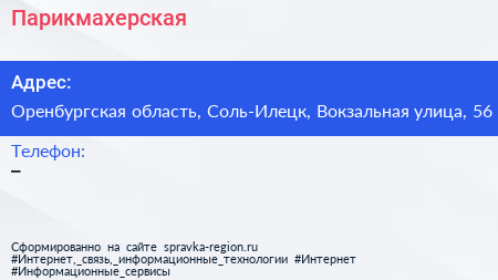 Парикмахерская по адресу Оренбургская область, Соль-Илецк, Вокзальная улица, 56 в дальнейшем Организация, размещена в следующих категориях: