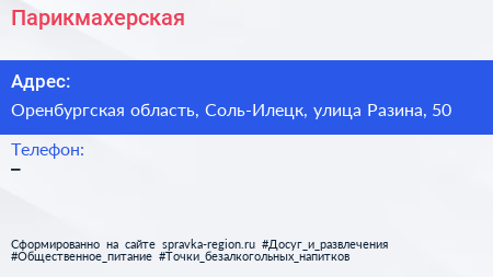 Парикмахерская по адресу Оренбургская область, Соль-Илецк, улица Разина, 50 в дальнейшем Организация, размещена в следующих категориях: