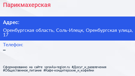 Парикмахерская по адресу Оренбургская область, Соль-Илецк, Оренбургская улица, 17 в дальнейшем Организация, размещена в следующих категориях:
