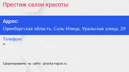 Престиж, салон красоты по адресу Оренбургская область, Соль-Илецк, Уральская улица, 29 в дальнейшем Организация, размещена в следующих категориях: