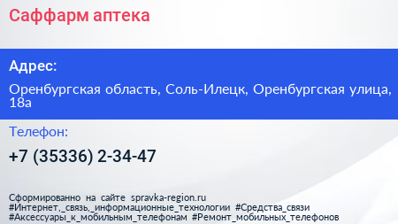 Саффарм, аптека по адресу Оренбургская область, Соль-Илецк, Оренбургская улица, 18а в дальнейшем Организация, размещена в следующих категориях: