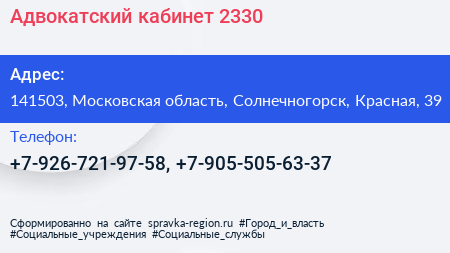 Адвокатский кабинет №2330 по адресу 141503, Московская область, Солнечногорск, Красная, 39 в дальнейшем Организация, размещена в следующих категориях:
