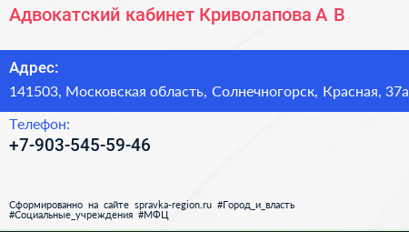 Адвокатский кабинет Криволапова А.В. по адресу 141503, Московская область, Солнечногорск, Красная, 37а в дальнейшем Организация, размещена в следующих категориях: