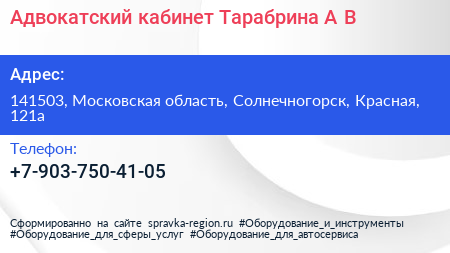 Адвокатский кабинет Тарабрина А.В. по адресу 141503, Московская область, Солнечногорск, Красная, 121а в дальнейшем Организация, размещена в следующих категориях: