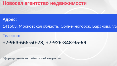 Новосел, агентство недвижимости по адресу 141503, Московская область, Солнечногорск, Баранова, 9а в дальнейшем Организация, размещена в следующих категориях: