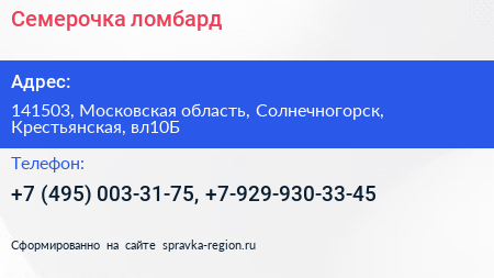 Семерочка, ломбард по адресу 141503, Московская область, Солнечногорск, Крестьянская, вл10Б в дальнейшем Организация, размещена в следующих категориях: