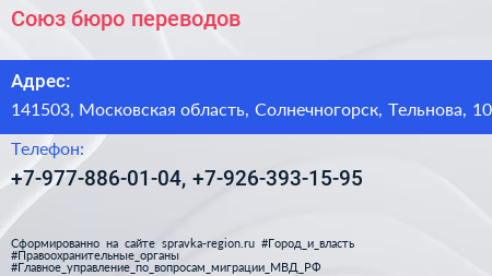 Союз, бюро переводов по адресу 141503, Московская область, Солнечногорск, Тельнова, 10 в дальнейшем Организация, размещена в следующих категориях: