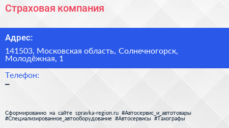 Страховая компания по адресу 141503, Московская область, Солнечногорск, Молодёжная, 1 в дальнейшем Организация, размещена в следующих категориях: