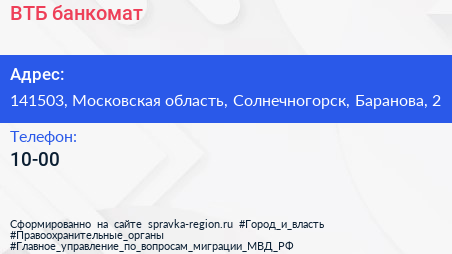 ВТБ, банкомат по адресу 141503, Московская область, Солнечногорск, Баранова, 2 в дальнейшем Организация, размещена в следующих категориях: