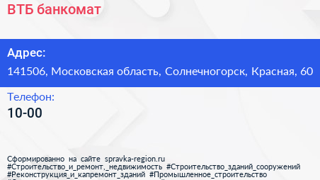 ВТБ, банкомат по адресу 141506, Московская область, Солнечногорск, Красная, 60 в дальнейшем Организация, размещена в следующих категориях: