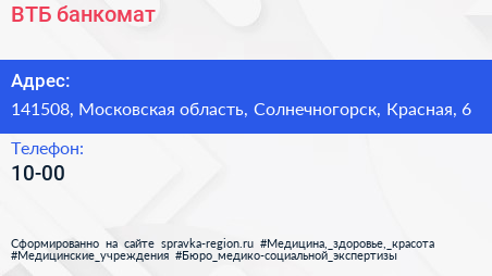 ВТБ, банкомат по адресу 141508, Московская область, Солнечногорск, Красная, 6 в дальнейшем Организация, размещена в следующих категориях: