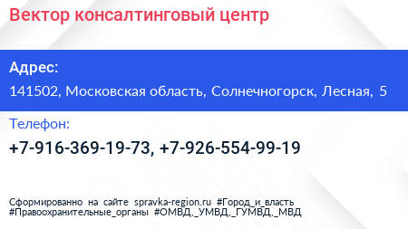 Вектор, консалтинговый центр по адресу 141502, Московская область, Солнечногорск, Лесная, 5 в дальнейшем Организация, размещена в следующих категориях: