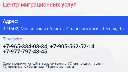Центр миграционных услуг по адресу 141502, Московская область, Солнечногорск, Лесная, 1а в дальнейшем Организация, размещена в следующих категориях: