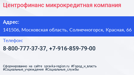 Центрофинанс, микрокредитная компания по адресу 141506, Московская область, Солнечногорск, Красная, 66 в дальнейшем Организация, размещена в следующих категориях: