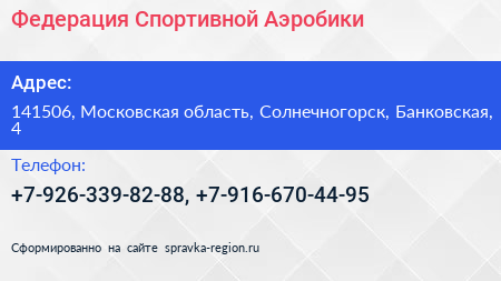 Федерация Спортивной Аэробики по адресу 141506, Московская область, Солнечногорск, Банковская, 4 в дальнейшем Организация, размещена в следующих категориях: