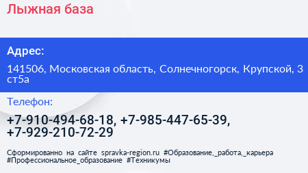 Лыжная база по адресу 141506, Московская область, Солнечногорск, Крупской, 3 ст5а в дальнейшем Организация, размещена в следующих категориях: