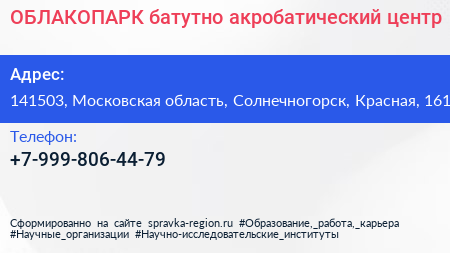 ОБЛАКОПАРК, батутно-акробатический центр по адресу 141503, Московская область, Солнечногорск, Красная, 161 в дальнейшем Организация, размещена в следующих категориях: