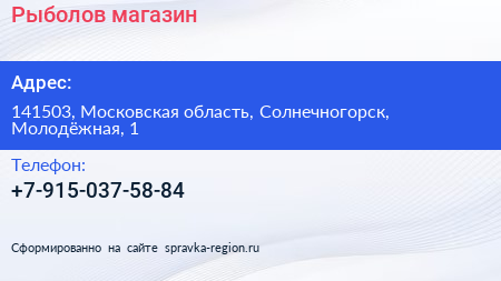 Рыболов, магазин по адресу 141503, Московская область, Солнечногорск, Молодёжная, 1 в дальнейшем Организация, размещена в следующих категориях: