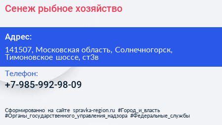 Сенеж, рыбное хозяйство по адресу 141507, Московская область, Солнечногорск, Тимоновское шоссе, ст3в в дальнейшем Организация, размещена в следующих категориях: