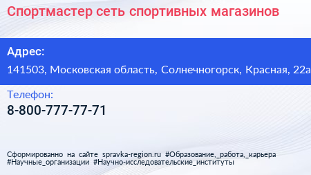 Спортмастер, сеть спортивных магазинов по адресу 141503, Московская область, Солнечногорск, Красная, 22а в дальнейшем Организация, размещена в следующих категориях: