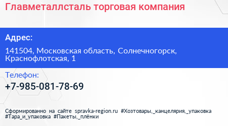 Главметаллсталь, торговая компания по адресу 141504, Московская область, Солнечногорск, Краснофлотская, 1 в дальнейшем Организация, размещена в следующих категориях: