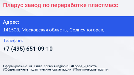 Пларус, завод по переработке пластмасс по адресу 141508, Московская область, Солнечногорск, в дальнейшем Организация, размещена в следующих категориях: