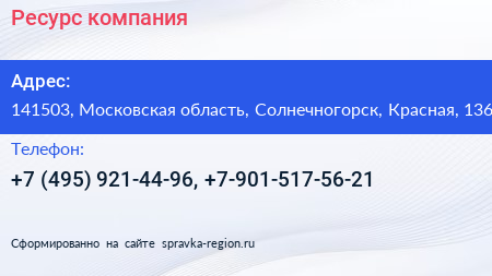 Ресурс, компания по адресу 141503, Московская область, Солнечногорск, Красная, 136 в дальнейшем Организация, размещена в следующих категориях: