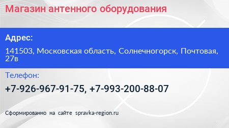 Магазин антенного оборудования по адресу 141503, Московская область, Солнечногорск, Почтовая, 27в в дальнейшем Организация, размещена в следующих категориях: