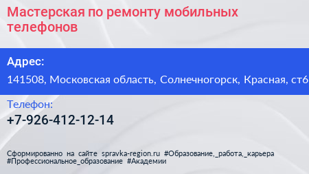 Мастерская по ремонту мобильных телефонов по адресу 141508, Московская область, Солнечногорск, Красная, ст6 в дальнейшем Организация, размещена в следующих категориях: