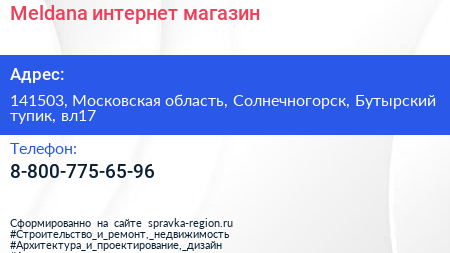 Meldana, интернет-магазин по адресу 141503, Московская область, Солнечногорск, Бутырский тупик, вл17 в дальнейшем Организация, размещена в следующих категориях: