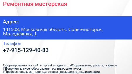 Ремонтная мастерская по адресу 141503, Московская область, Солнечногорск, Молодёжная, 1 в дальнейшем Организация, размещена в следующих категориях: