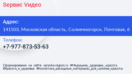 Sервис Vидео по адресу 141503, Московская область, Солнечногорск, Почтовая, 6 в дальнейшем Организация, размещена в следующих категориях: