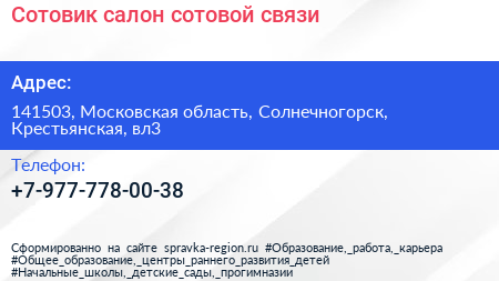 Сотовик, салон сотовой связи по адресу 141503, Московская область, Солнечногорск, Крестьянская, вл3 в дальнейшем Организация, размещена в следующих категориях: