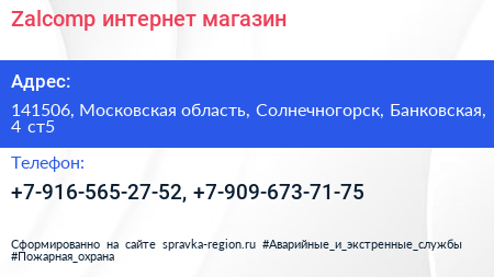 Zalcomp, интернет-магазин по адресу 141506, Московская область, Солнечногорск, Банковская, 4 ст5 в дальнейшем Организация, размещена в следующих категориях: